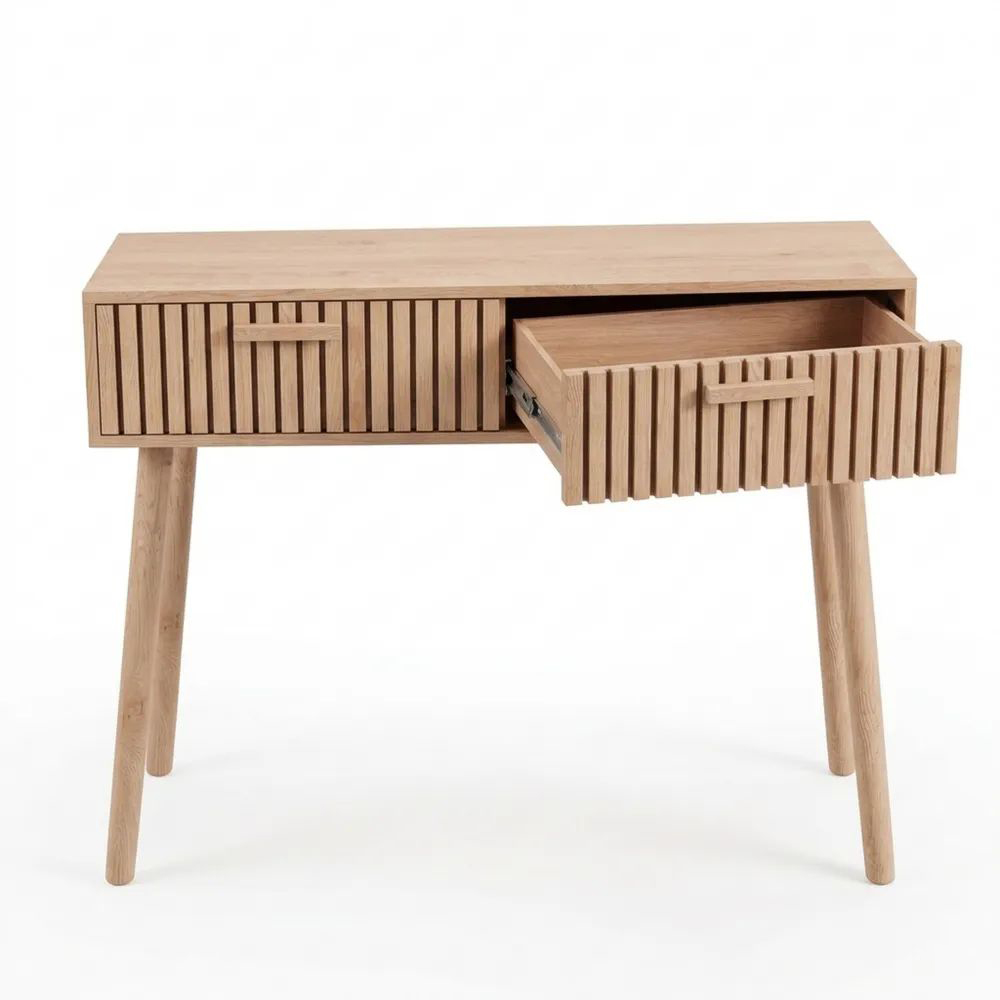 Konstruktion mit Kippschutz: Die Konsole wird an der Wand befestigt, um Stabilität zu gewährleisten. Rutschfeste Unterlagen erhöhen die Stabilität und schützen den Boden. Optik des Schreibtischs: Dieser Schreibtisch besteht aus Holz mit einem Eichenfurnier, das die natürliche Holzstruktur betont. Schreibtisch mit Schubladen: Der Schreibtisch bietet mit 2 Schubladen Stauraum für Bücher, Gläser, Kosmetika und andere Gegenstände. Oberfläche des Tisches: Die glatte und kratzfeste Oberfläche des Schminktisches ist einfach zu reinigen. Metallschienen ermöglichen leichten Zugriff auf die gelagerten Gegenstände. Montage des Schreibtischs: Der Schreibtisch wird mit Anweisungen geliefert, die eine einfache Installation ermöglichen.