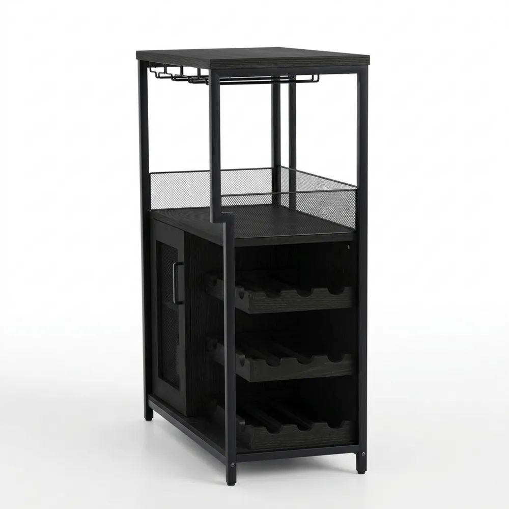 Dieser Barschrank besteht aus MDF-Platten mit Eisenbeinen und bietet Stabilität und Langlebigkeit. Er hat die Maße 69 cm x 35 cm x 92 cm und eignet sich für Küche, Wohnzimmer oder Minibar. Ausgestattet mit einem abnehmbaren Weinregal für 12 Flaschen, einem Glashalter für 9 Gläser und einem Schrank mit Gittertür. Die obere Ablagefläche dient als Servierfläche, das mittlere Fach bietet Platz für Flaschen, und das untere Fach ist für Eisbehälter vorgesehen. Der Schrank passt zu verschiedenen Einrichtungsstilen und eignet sich für Wohnzimmer oder Esszimmer. Er ist einfach zu montieren, da Teile beschriftet sind und eine Anleitung vorliegt.